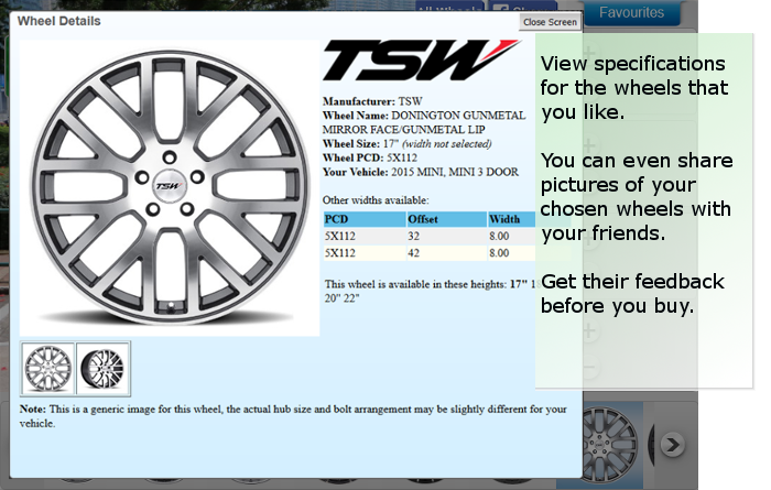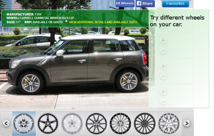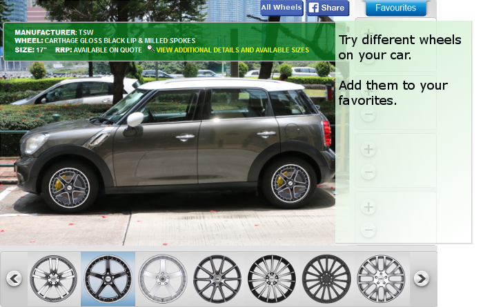 Using MagMatcher is simple, upload your favourite car photo (or choose one of ours), customise your vehicle configuration then try different combinations and sizes of wheels until you find the ones you desire. Our SPAGI (SPatial And Geometric Imaging) Technology provides the smarts behind the scenes to render life-like final images, giving an unparalleled representation of your car with your chosen alloy wheels applied. To help maintain the realism you can even customise how your vehicles brakes are displayed by selecting the rotor style and choosing a custom caliper colour. With Facebook integration included you can get feedback from your friends to help decide which wheels to buy.
